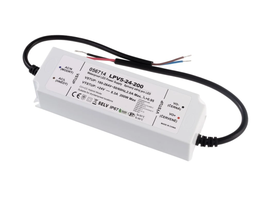Kvalitní voděodolný LED zdroj pro LED pásky a další 24V LED osvětlení nabízíme v krytí IP67. Jedná se o tzv. hybrid CV+CC (constant voltage + constant current) zdroj, což jsou napájecí zdroje s konstantním napětím a možností fungovat jako zdroj konstantního proudu. Jejich primární funkcí je dodávat konstatní napětí, avšak v případě přetížení zdroje nebo připojení LED zátěže s napětím nižším než je nominální výstupní napětí zdroje, dochází k přechodu zdroje do režimu s konstantním výstupním proudem. Toto omezení výstupního proudu je v tomto případě považováno za normální provozní stav, nikoli za poruchu, což je odlišné od čistě CC (konstantní proudových) zdrojů.
