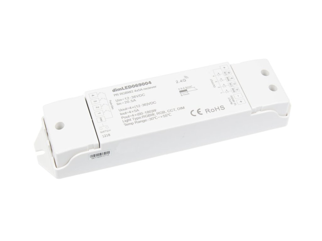 RF (radiofrekvenční) přijímač a stmívač pro RGBW LED produkty. Přijímač může být ukrytý (za zdí, sádrokartónem či ve skříni), není nutná přímá viditelnost přijímače pro ovladač.